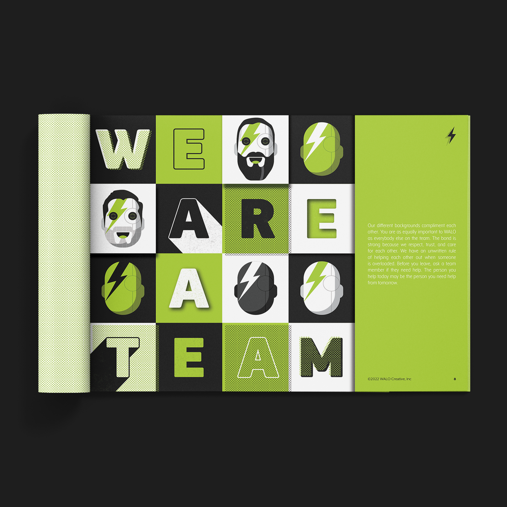 WALO, a Dallas-based independent ad agency, is home to a group of thinkers and doers who bring a unique blend of guts, soul, and play to their work. As part of the WALO creative team, our daily tasks involve building on the agency's brand – from the employee handbook to crafting engaging social content. Each ask presents a fun challenge as we aim to showcase the agency's bold personality.